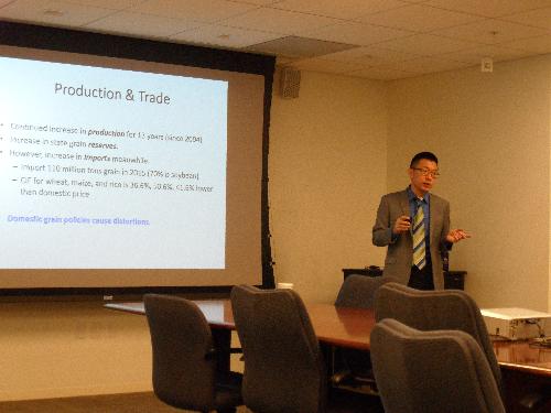 访问期间,贾相平教授为ERS研究人员做了题为“Recovering Agrifood Market and Transforming Agricultural Production in China ”的学术报告。报告围绕农产品市场治理和农业产业经营体系两个核心问题,对涉农公司、农民专业合作社、“农超对接”、农村电子商务等产业组织和经济形态进行了详细的阐述。在此基础上,对中国农业集约化生产经营的资源环境、制度及政策做了介绍和汇报。会上,专家们就中国农业转型与发展过程中面临的挑战、农业产业体系和经营体系、劳动经济学、土地经济学等研究领域进行了对话交流。