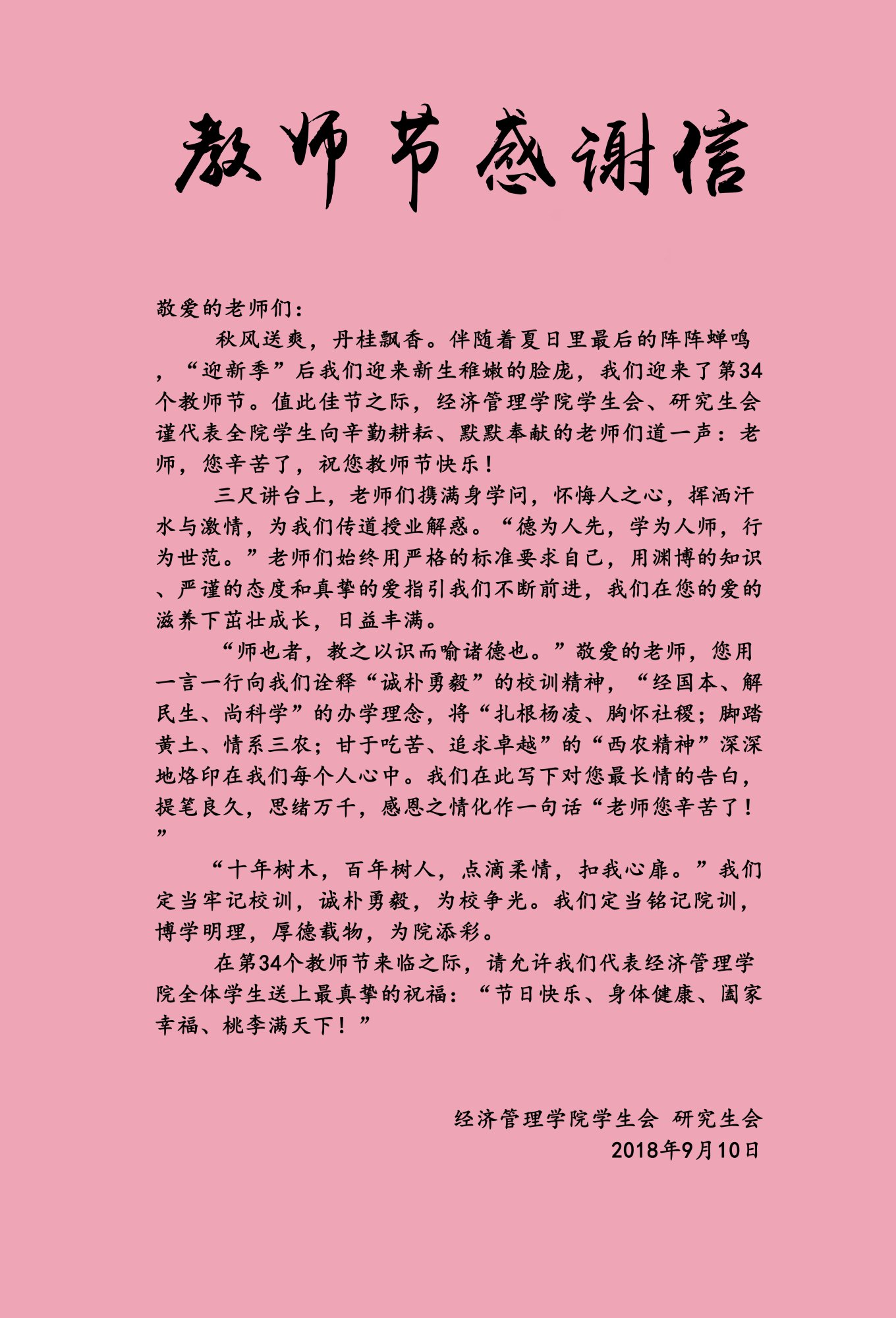 “师也者,教之以识而喻诸德也。”敬爱的老师,您用一言一行向我们诠释“诚朴勇毅”的校训精神,“经国本、解民生、尚科学”的办学理念,将“扎根杨凌、胸怀社稷;脚踏黄土、情系三农;甘于吃苦、追求卓越”的“西农精神”深深地烙印在我们每个人心中。我们在此写下对您最长情的告白,提笔良久,思绪万千,感恩之情化作一句话“老师,您辛苦了!”