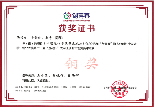 11月4日,由共青团中央、教育部、人力资源和社会保障部、中国科协、全国学联、浙江省人民政府共同主办的2018年“创青春”浙大双创杯全国大学生创业大赛在浙江大学落下帷幕。由永利官网姜志德教授指导的学生创业项目--《四稷魔方智慧社区农业》经历校赛、省赛一路过关斩将最终荣获国赛铜奖。