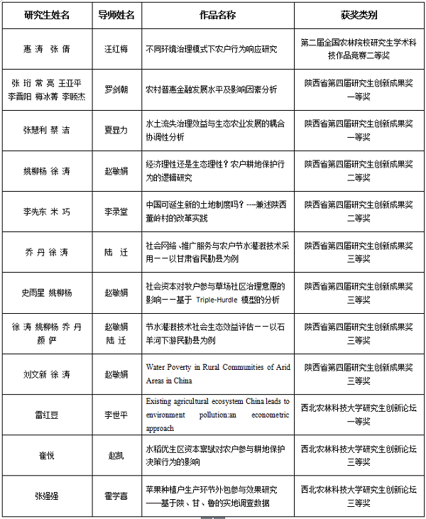 ——第二届全国农林院校研究生学术科技作品竞赛二等奖1项。2018年12月7日,由中国学位与研究生教育学会农林学科工作委员会主办,南京农业大学和南京林业大学承办的第二届全国农林院校研究生学术科技作品决赛在南京农业大学瀚苑宾馆顺利召开,永利官网研究生惠涛等作为唯一入围团队,代表我校参加本次决赛。竞赛以“激发创新驱动,推动人才培养,增强社会服务,助力乡村振兴”为宗旨,经评委现场评审,惠涛等人完成的《不同环境治理模式下农户行为研究》喜获二等奖。