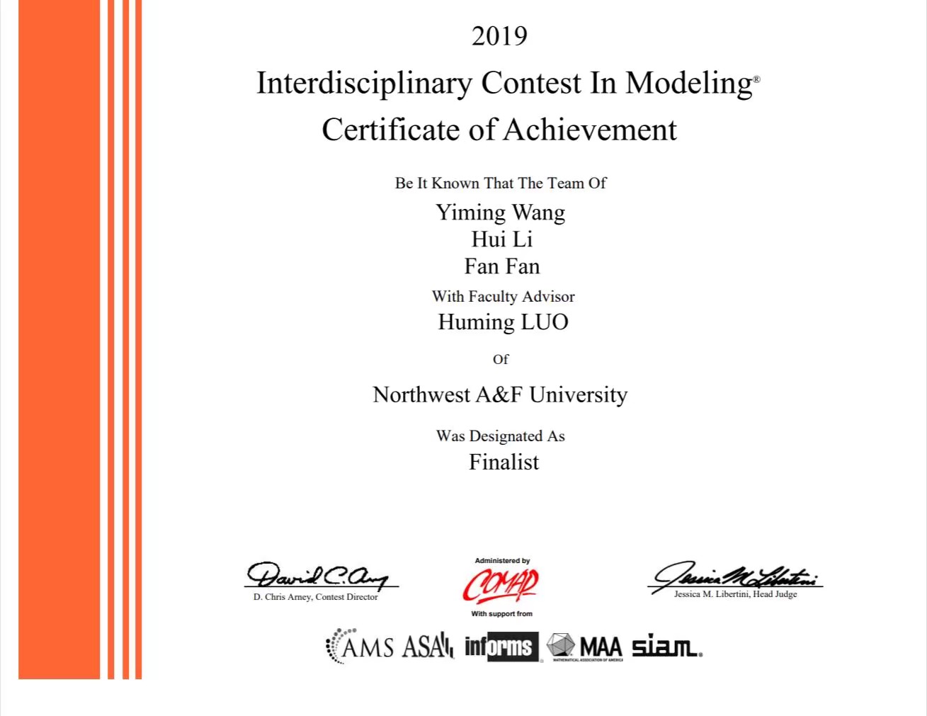 4月19日由美国数学及其应用联合会主办的美国大学生数学建模竞赛发布获奖名单,永利官网王一名、李辉和信息学院樊凡组成的团队作品《The Virtual Escape of the Louvre》最终获得了F奖(Finalist)。