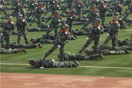 “送——军旗”看军旗飘飘略过眼角,军训汇演正式拉开帷幕。女兵连的擒敌拳“哈”声震天,每一招都猛如虎,每一式都矫如龙,一招一式,尽显“巾帼不让须眉”之势;男儿们也不甘示弱,警棍术中精准的动作、坚毅的眼神、军人的刚强无一不令人赞叹,热血沸腾;女子防身术的表演中,男兵女兵齐上阵,刚柔并济,相得益彰;特战情景剧时烟雾缭绕,全真模拟显真章,匍匐前进习得军人之风,真情实感铸就军人之魂;手语《感恩的心》,莘莘学子用动情歌声唱出浓浓感恩意,感谢陪伴14天军训生活的可爱之人。