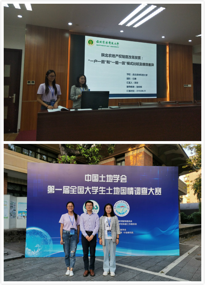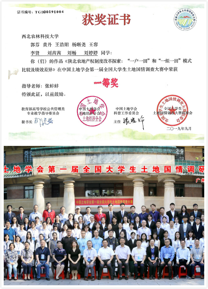 永利官网土地资源管理专业2017级本科生郭芬、黄丹等领衔的行者团队在永利官网青年教师张蚌蚌博士指导下,以“陕北农地产权制度改革探索:“一户一田”和“一组一田”模式比较及绩效差异”参赛作品入围决赛并荣获一等奖(奖金5000元)。该奖项的获得,有效锻炼了本科生的探索和研究能力,显著促进本科生加强专业课程学习并学以致用。队长郭芬感言,从确定题目、到问卷设计、到报告撰写,一次次的修改和制作PPT,多次的演练,成绩的取的离不开指导教师和陈海滨老师的悉心指导,感谢学院提供的平台。指导老师张蚌蚌说,“能够与东道主华南理工大学代表队,南京大学和浙江大学代表队共同获得一等奖,提升了我校在同行中的声誉;体现了本科生的卓越创新能力,培养了学生的爱国和恋土情怀,激发了学生探索认知祖国土地的激情”。