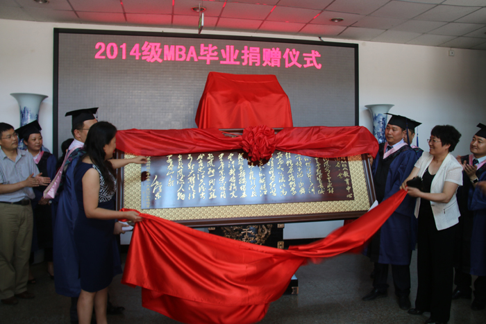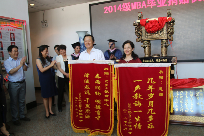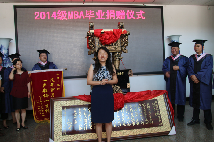 永利官网2016届MBA毕业生带着一份真挚的感情,感恩母校、爱心捐赠。活动在欢快而又热烈的气氛中拉开了序幕,仪式由第二届MBA联合会副主席宋博主持,主席刘云涛首先代表全体同学发表了感想,表达了对学校、学院培养的感激、感恩和不舍之情。MBA教育中心主任赵敏娟、党委书记姚晓霞为捐赠纪念品揭幕。随着一席红布的落地,一尊气势不凡的“千秋鼎盛”大鼎和牌匾映入了大家的眼帘。这尊大鼎和牌匾表达了毕业生们对学院的感激之情,也表达了他们对学校和老师“桃李满天下、学子遍中华”的祝福和祝愿。随后,MBA教育中心常务副主任孟全省、MBA导师代表孔荣接受学生代表李艳梅、岳桂香向MBA教育中心、老师赠送的锦旗。