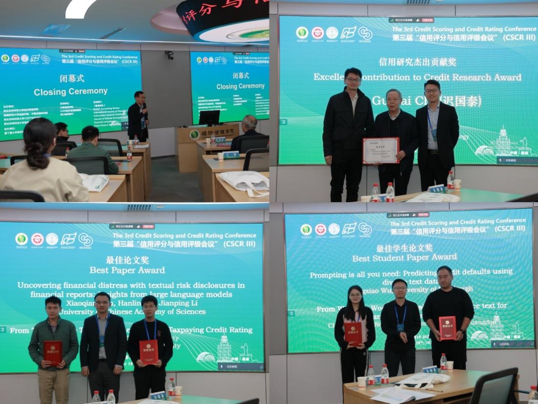 闭幕式由西南财经大学金融学院李志勇教授主持并做总结发言。他表示,本届会议收到106篇投稿,经组委会评审共接收55篇做交流汇报,会议最终评选出最佳学生论文2篇、最佳论文2篇,大连理工大学迟国泰教授荣获信用研究杰出贡献奖。会后,会务组将根据作者意向,向《管理评论》《Financial Innovation》《China Finance Review International》《Information Systems Frontiers》《The British Accounting Review》《Journal of Chinese Economic and Business Studies》《International Journal of Financial Engineering》等7个会议支持期刊推荐发表。据悉,第四届信用评分与信用评级会议将于2026年在合肥工业大学举办。第四届会议举办方代表、合肥工业大学蒋翠清教授在闭幕式上表示,将努力做好各项会务服务工作,诚邀各位专家学者、行业领袖共赴合肥。至此,本届会议圆满落下帷幕。