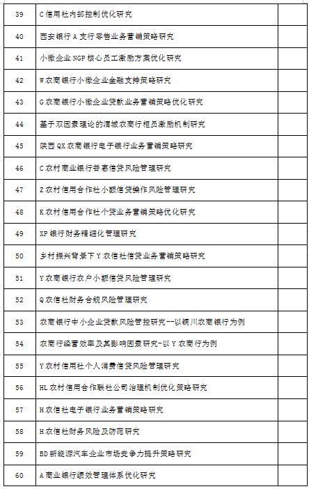 经陕西MBA学院第50次毕业论文评审,我校报送的全部毕业论文中,127篇通过(其中1篇评定优秀毕业论文),14篇需修改,0篇重做。具体情况如下: