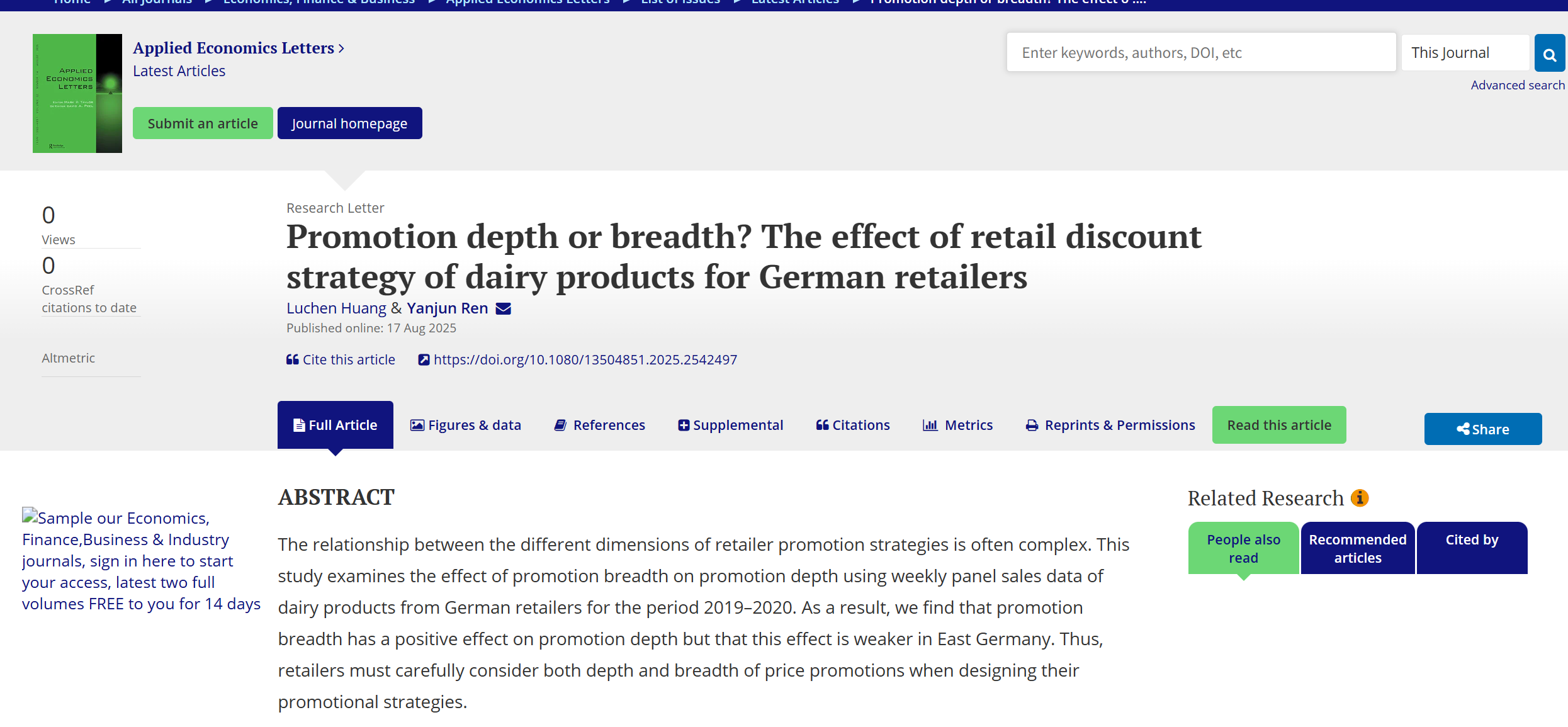 • 团队博士生黄禄臣围绕食品价格促销策略发表最新研究