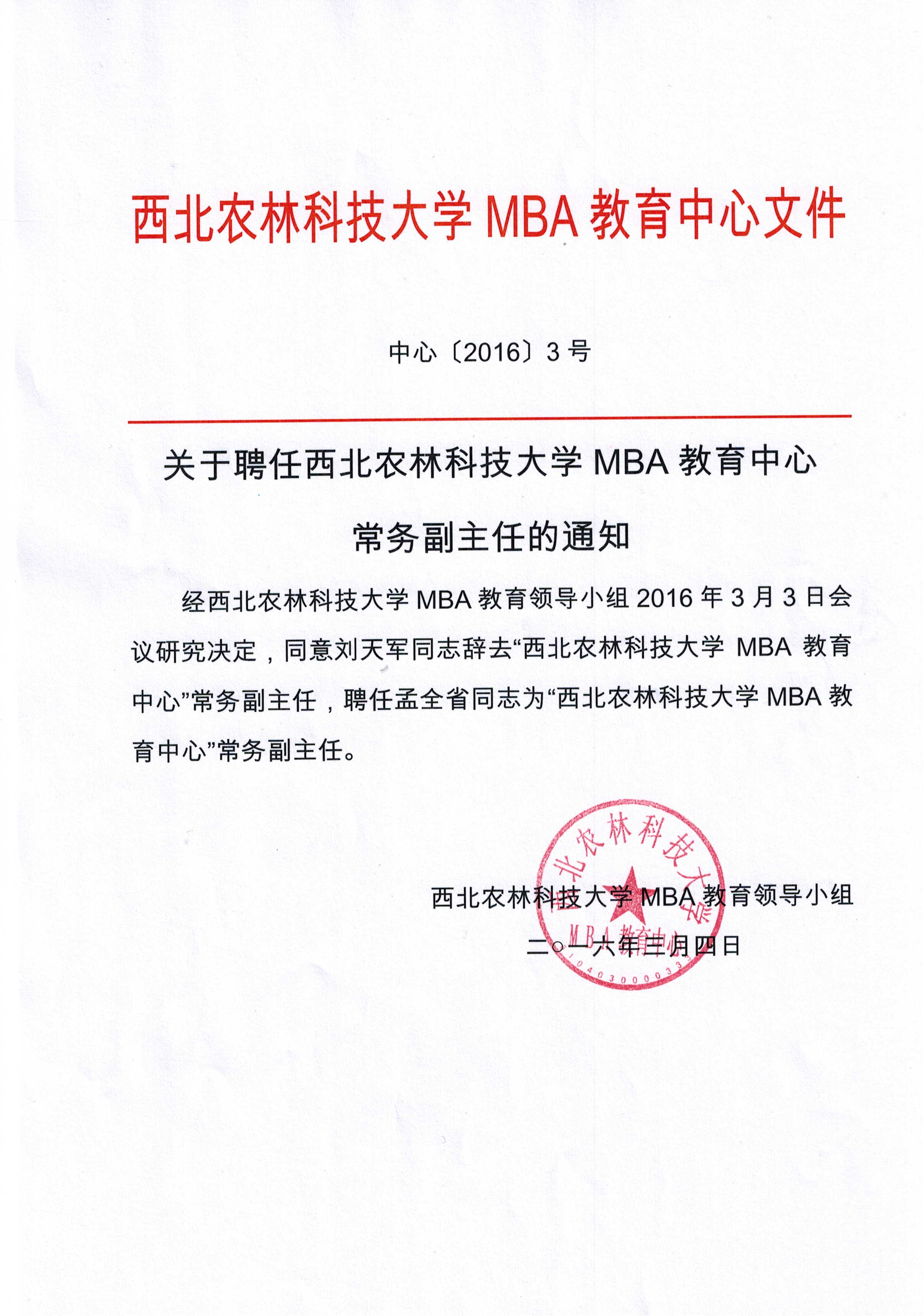 关于聘任yl6809永利官网MBA教育中心常务副主任的通知