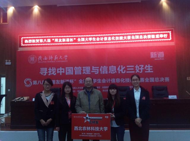 12月5日,“2014年寻找中国管理与信息化三好生暨第八届“用友新道杯”全国大学生会计信息化技能大赛”全国总决赛最终结果公布,由我校李民寿副教授、王宇涛高级实验师指导的我校代表队荣获本科组一等奖,创造了陕西省在该项比赛中的历史最好成绩。