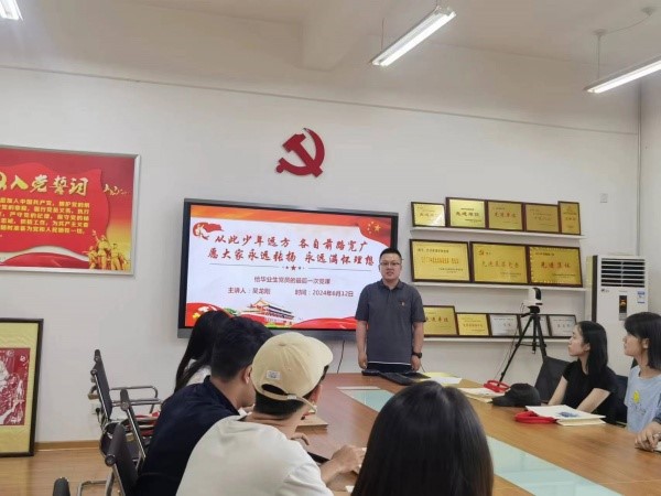 会议伊始,吴龙刚为毕业生党员赠送毕业礼物,鼓励毕业生党员们不忘初心,牢记使命,在新的岗位上继续发光发热,表达对他们未来前程的美好祝愿。随后,全体党员在庄严的氛围中重温入党誓词,共同回顾和铭记自己的初心和誓言。紧接着,吴龙刚以“最后一节党课”为主题全面总结了支部过去一年的各项工作,对支部党员的辛勤付出和表现给予了充分的肯定。针对毕业生党员这一特殊群体,他提出了要有理想和追求,将个人的价值融入到集体和社会的发展中;要有奋斗精神和情怀,勇于担当,善于作为,积极面对挑战;要有宽广的胸怀和深厚的素养,懂得感恩,保持谦逊,鼓励毕业生党员们以这些嘱托为指导,不忘初心,牢记使命,肩负好实现个人价值和服务国家建设的双重责任。